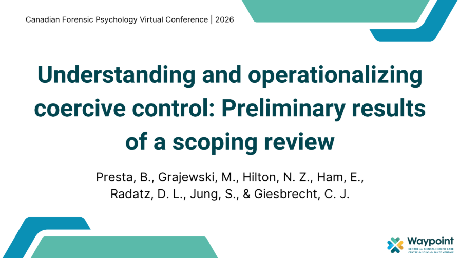 Presenter: Dr. Zoe Hilton, PhD, CPsych Dr. Hilton is a Professor of Psychiatry in the Temerty Faculty of Medicine, University of Toronto, and the Senior Research Scientist at Waypoint.
